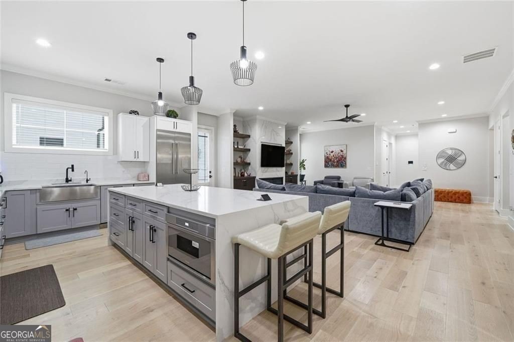 The bright, open main level welcomes you with a spacious family room that blends naturally into a beautifully appointed kitchen featuring premium Thermador appliances, custom cabinetry, gleaming quartz counters, and a generous island designed for gathering, cooking, and connecting. The primary suite is a true haven, complete with a cozy electric fireplace with heater, a private walkout patio, its own dedicated HVAC zone for personalized comfort, and an expansive office next door that opens to a covered patio, and allows access to the backyard. The spa-inspired bathroom invites relaxation with modern finishes, a dual shower panel, walk-in shower, a two-person jetted soaking tub, and individual (his/her) custom closets. Across the main level, a private guest suite provides comfort and independence with its own full bath and separate outdoor entrance perfect for extended stays or multigenerational living. Additional main-floor conveniences include a well-designed laundry room with built-in cabinetry and a large utility sink, plus three oversized garage bays arranged in a functional 2-plus-1 layout. Upstairs, you’ll find three spacious bedrooms, each with its own ensuite full bath, ensuring comfort and privacy for all. A large media room offers walkout access to the oversized terrace, perfect for entertainment. An additional office/flex loft space includes its own private balcony. A secondary laundry room on the upper level adds to daily convenience. Additional Features * Whole-home water softener and reverse osmosis filtration system * Multiple outdoor living spaces * Thoughtful layout for multigenerational families, guests, or work-from-home needs Ideally situated just minutes from Downtown Alpharetta, with quick access to North Point Mall, Roswell, State Bridge, Jones Bridge, and Kimball Bridge. Enjoy nearby outdoor amenities including Newtown Park, Rock Mill Park, and direct access to the Greenway to help facilitate an active lifestyle.