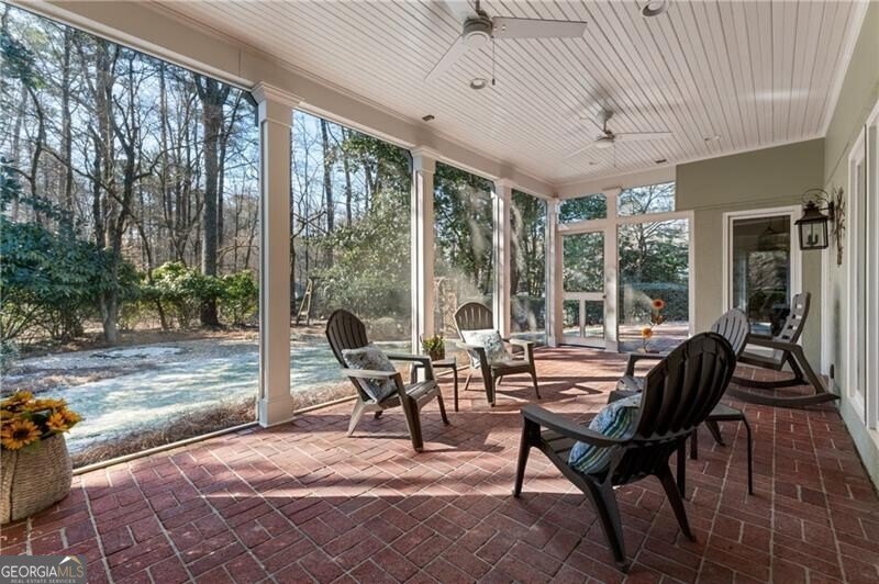 Tucked within one of Alpharetta’s most loved communities, this beautifully renovated stepless ranch offers the ease of one-level living, light-filled gathering spaces, and the feel of a true entertainer’s home, all set against a peaceful and private backyard retreat. Set on one of the larger lots in Windward and surrounded by nature, the home offers added privacy, a serene setting, and generous space between neighboring homes. From the moment you step inside, the home feels bright, open, and welcoming. Off the foyer to the right, the dining room makes an immediate impression with its beautiful wallpaper and stunning crystal chandelier, creating an elegant space for gatherings and special occasions. As you continue into the home, it opens into expansive living areas across the back, where a wall of windows and skylights fill the space with natural light and calming backyard views. The kitchen, family room, and additional living area flow together seamlessly, creating multiple spaces to relax, host, and entertain while still maintaining an open, connected design. One of the most significant transformations is the fully renovated kitchen, where walls were opened to create a more spacious and functional layout. Featuring new cabinetry, stainless Bosch appliances, and striking Taj Mahal quartzite countertops, it truly serves as the heart of the home and a natural gathering place for friends and family. Extensive improvements inside and out add both beauty and peace of mind. The exterior has been thoughtfully enhanced with a new driveway, sprinkler system, sod, landscape lighting, flagstone walkways, full exterior paint, and a comprehensive drainage system with French drains running from the backyard to the front. Inside, acacia hardwood flooring was installed throughout and complemented by recessed lighting, custom window treatments, fresh interior paint, upgraded fireplace surrounds, added insulation, new ductwork replacing the original whole-house ventilation system, and a relocated electrical panel. The laundry area was also expanded with relocated plumbing, custom shelving, and workspace, while the landscaped backyard and screened porch create a private, peaceful setting ideal for relaxing or entertaining. The primary suite is tucked along the back of the home for privacy and enjoys beautiful natural light and backyard views. It features two generous custom closets and a thoughtfully renovated bath with an expanded walk-in shower, new flooring, and an updated double vanity, creating a spa-like retreat. Two additional bedrooms provide flexibility for guests, a home office, or everyday living, and all bathrooms have been tastefully updated. Permanent stairs lead to a large unfinished attic, offering excellent potential for future expansion – ideal for additional living space, a private office, or a recreation area. Windward is one of Alpharetta’s most established and sought-after communities, known for its scenic setting and active lifestyle. The neighborhood is centered around a beautiful 200-acre lake and offers swim and tennis, pickleball, parks, walking paths, and optional membership opportunities nearby for golf and lake amenities. It’s a community where neighbors connect, spend time outdoors, and truly enjoy where they live. Residents also love the quiet, serene feel and the sense of space throughout the neighborhood. Located in the heart of Alpharetta, the home is just minutes from Downtown Alpharetta, Avalon, Halcyon, and the Big Creek Greenway, with Publix, Kroger, Fresh Market, Whole Foods, and countless dining and shopping options all within a short distance. Top-rated schools, nearby medical facilities, and easy access to GA 400 make everyday living convenient and connected. A rare opportunity to own a thoughtfully updated ranch designed for comfortable living, effortless entertaining, and a lifestyle that feels both peaceful and vibrant.