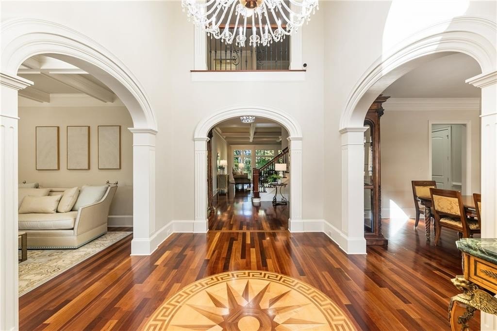Exquisitely appointed 4 sides brick home with over 8400 sq ft of living space serviced by an Elevator! Get ready to be amazed at the craftsmanship of heavy molding including coffered ceilings, trey ceilings, thick fluted casements, thick door and window trim, and extensive crown molding. Rich refinished Brazilian cherry hardwood floors throughout the homes main 2 levels with detailed inlay in the foyer. Your company is greeted with a brick walkway, concrete baluster railings and french stained front doors. Step inside to the dramatic 2-story foyer with a large chandelier (on a lift for easy cleaning) flanked by arched casement openings to the large study and banquet-size dining room. Continue to the extend foyer flanked by the elevator access and private hall that houses a coat closet, guest powder bath and large guest ensuite with a large walk-in custom closet. Continue to the transom window lined & coffered ceiling Great Room with 6ft high stone hearth fireplace, perfect for all your holiday gatherings. Beyond this space is the heart of the home, the Grand Kitchen is a masterpiece with all wood hand-carved details. The massive Chef’s kitchen is equipped with professional appliances including a Thermador 48″ gas range, 3 ovens, warming drawer, 2 dishwashers, 48″ Sub Zero fridge/freezer, an additional prep sink in the expansive island with custom granite, a butler pantry with wine cooler and ice maker. The space accommodates a custom wall built in entertainment center w/carved details and lighted cabinetry. Beyond this space is an oversized sun room with tile floors, windows galore, equipped with motorized shades, french doors leading to the patio and overlooking the serene lush backyard. Upstairs are 4 super sized en-suites all with walk-in custom closets and two with additional custom built in Armoires. There is a large laundry room with sink/built ins and extra storage. The upper level is finished off with a luxury Primary suite that is divine with an expansive bedroom equipped with another custom cast stone hearth fireplace with sitting area. The spa bath offers a barrel ceiling, whirlpool tub, travertine stone shower, double wood vanities and a full custom closet with wood enclosures for protecting your wardrobe! The Daylight terrace level is another house in itself! It offers a full kitchen with granite counters, surface cooktop, microwave, dishwasher, a dining area, a guest powder room, a grand entertaining room with chandelier offering French doors to a paver patio for alfresco dining under the stars! The terrace is finished off with a gym, a large guest bedroom with a massive closet, full bath. There are three large storage areas for all your organization needs. Outside the property offers a large paver driveway, numerous garden areas, a metal fenced yard with extensive landscaping and perfect for a pool should you desire. Don’t miss this truly custom home with an ultra convenient location with easy access to the Greenway trails, Avalon, Downtown Alpharetta and Northpoint, offering all the green space, shopping and eateries you need under 3 miles! Front photo has been digitally modified to show what home would look like with painted brick.
